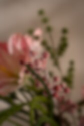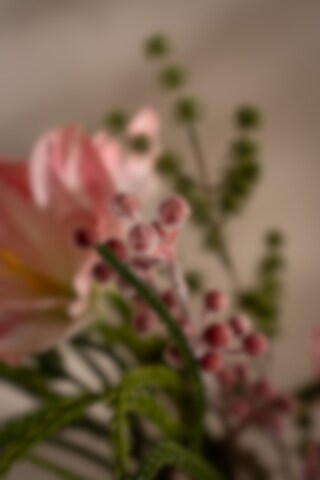 En rosa julbukett? Absolut! Sätt buketten i en urna för att få en maffig känsla i rummet. Denna fantastiska sammansättning inkluderar Amaryllis i fina skiftningar, vacker Julros, Lärkkvist, frostiga bär och en grankvist som hänger vackert.