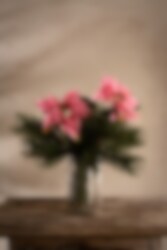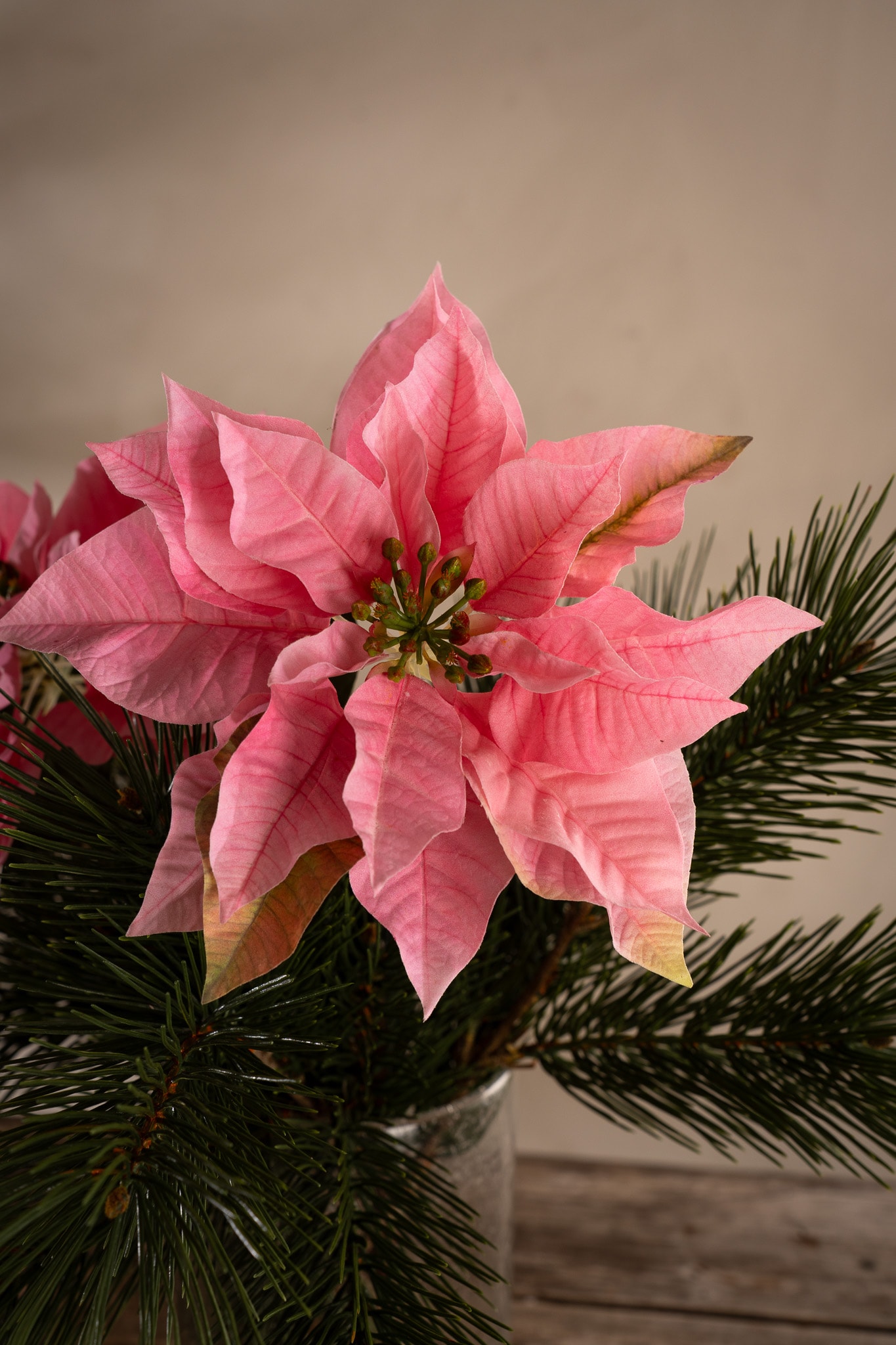 En enkel bukett men det blir fort något annat när vi får in rosa, det skapar en hemtrevlig och varm känsla i hemmet. Ett måste nu i jul! Denna underbara sammansättning inkluderar Julstjärnor och tallkvistar i en fin mörk grön kulör.